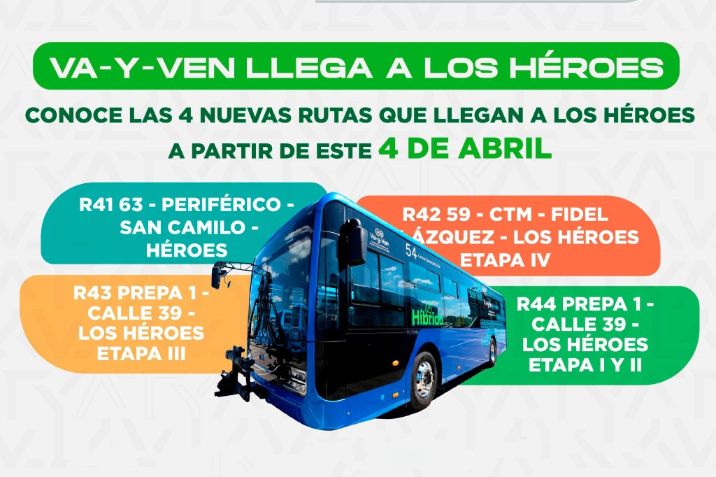 De acuerdo con la Agencia de Transporte de Yucatán, estas nuevas 4 rutas, que brindarán servicio a partir del viernes 4 serán: R-41 63-Periférico-San Camilo-Héroes; R-42 59-CTM-Fidel Velázquez-Los Héroes Etapa IV; R-43 Prepa 1-Calle 39-Los Héroes Etapa III y R-44 Prepa 1-Calle 39-Los Héroes Etapa I y II; las cuales tendrán su paradero en la calle 63 entre 52 y 54 del Centro Histórico.
