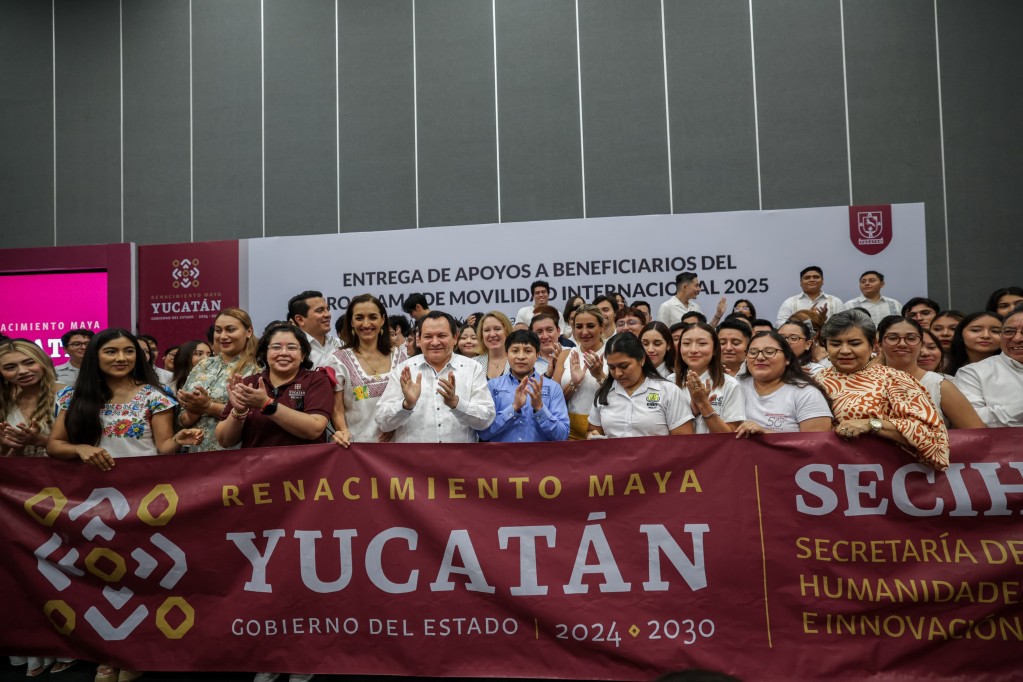 El gobernador del Estado, Joaquín Díaz Mena, encabezó este viernes la entrega de becas para que 100 estudiantes yucatecos, de diferentes universidades, puedan viajar a Canadá para fortalecer la herramienta del inglés.