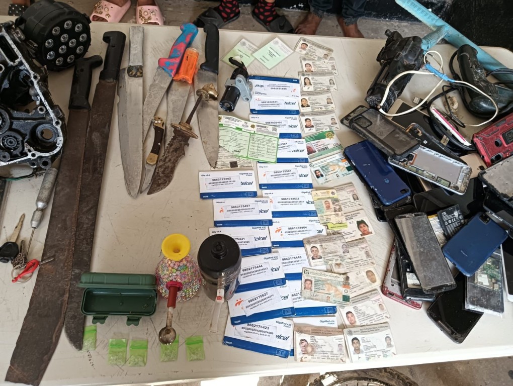 Los oficiales lograron recuperar varias pertenencias entre ellas tres bicicletas, 17 identificaciones varias, 16 chips de telefonía, 1 taladro, 5 cuchillos, 2 machetes, 1 punzón, 2 ruedas de bicicleta, 1 bastón policial, 1 bomba de agua, 2 lámpara Led, 1 switch, 1 mando de motocicleta y 1 paquete de rayos para motocicleta y 30 teléfonos celular en mal estado.