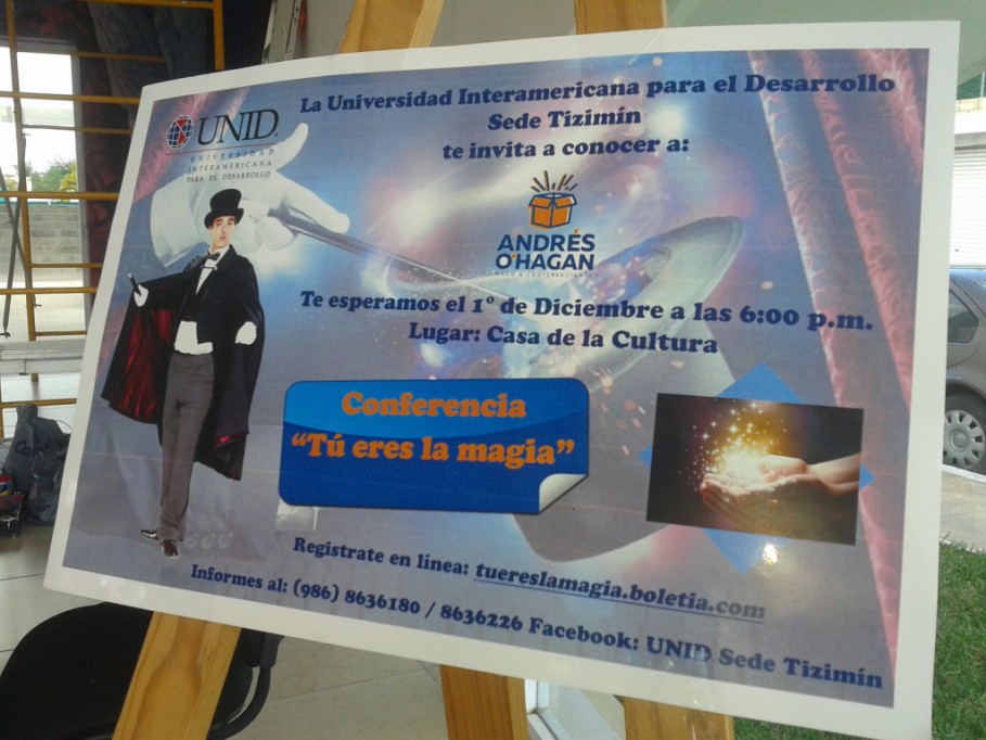 El patrocinio de la Universidad Interamericana para el Desarrollo (UNID), sede Tizimín, hizo posible esta conferencia llamada “Tú eres la magia”, que tendrá lugar en la Casa de la Cultura “Tzimin Kah” a partir de las 5 de la tarde.