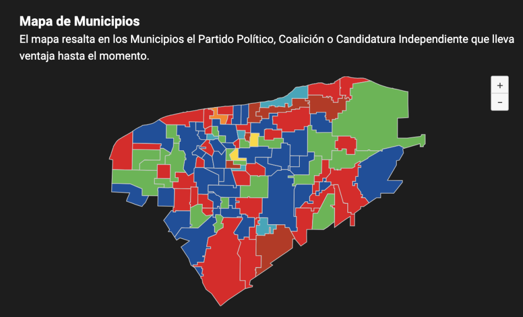 En Rio Lagartos, la morenista Yesenia Loría aventaja con más del 14% sobre su contrincante más fuerte Mirza Ramos, que representó al PAN, PRI y Panal con el 36% de los sufragios. Un tercer candidato por el Partido Verde, Manuel Rodríguez, apenas alcanzó el 11% de los votos.