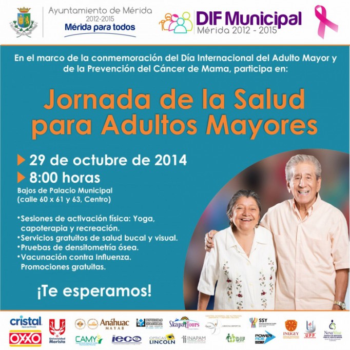 Este miércoles 29 de octubre el ayuntamiento de Mérida a través del DIF municipal llevara a cabo las "Jornadas de la Salud para Adultos Mayores", evento que será presidido por el alcalde Renán Barrera Concha y su esposa la Presidenta del DIF Mérida, Diana Castillo Laviada de Barrera.