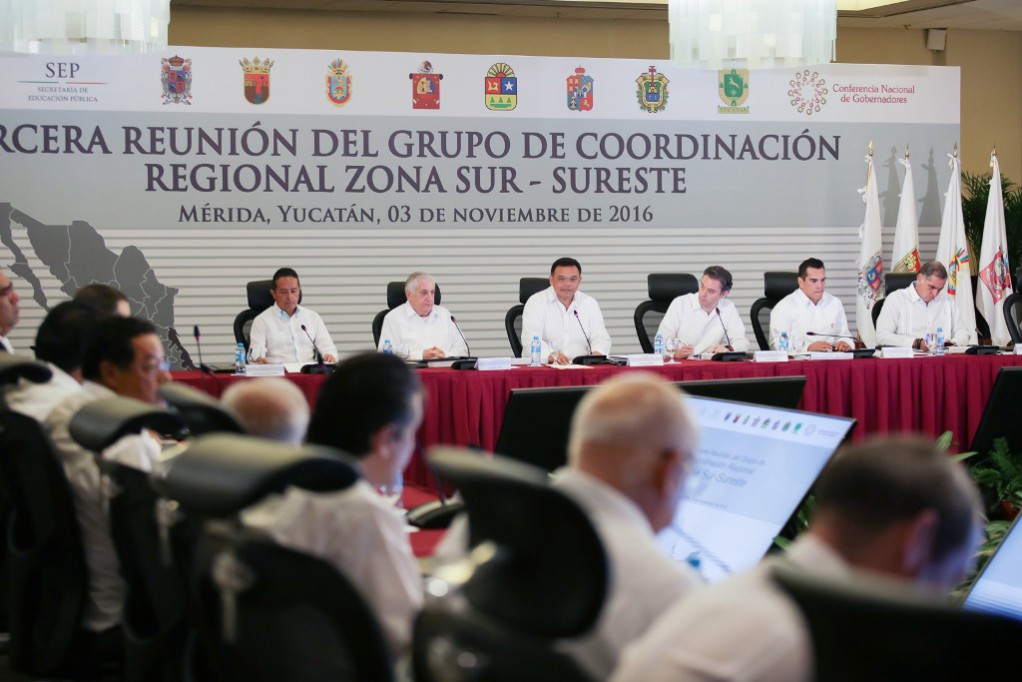 Con el objetivo de dar seguimiento a las prioridades planteadas por la Reforma Educativa, se llevó a cabo este jueves en Mérida la Tercera Reunión del Grupo de Coordinación Región Zona Sur-Sureste, en la cual participo el Secretario de Educación Pública Federal y diversos gobernadores del país.