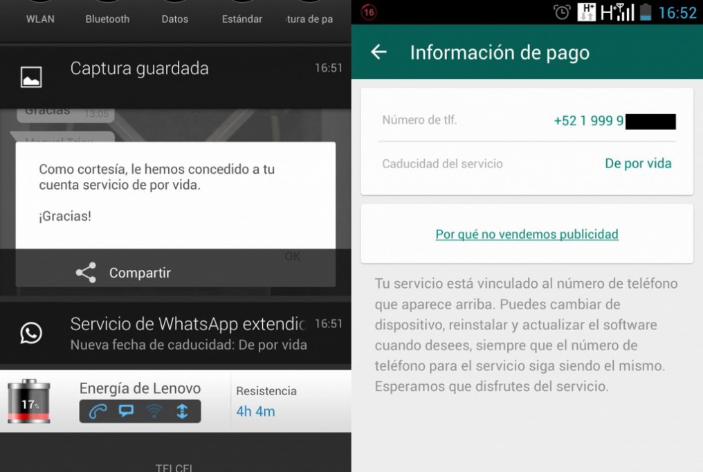Sin embargo, desde ayer, muchos usuarios recibieron dos mensajes, el primero para darles una nueva fecha de caducidad a su servicio y el segundo con la leyenda “Como cortesía, le hemos concedido a tu cuenta servicio de por vida. ¡Gracias!”.