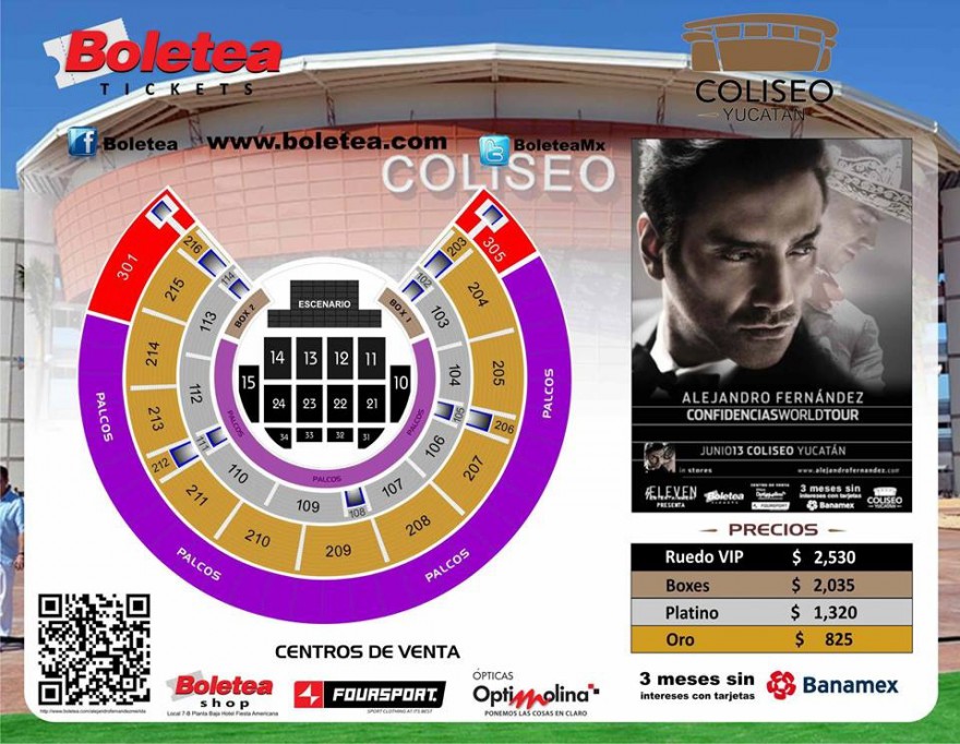 "Está la taquilla propiamente del Coliseo en un horario de 10 am hasta las 7 de la noche y caso de que haya cola, vamos a extender los horarios; tenemos también la tienda Optimolina con tres sucursales en Altabrisa, Gran Plaza y Sendero, la tienda Foursport y tenemos un lugar especial diseñado por parte de la boletera donde pueden adquirir sus boletos. El ruedo VIP es de 2 mil 530, boxes los vamos a estar dando en 2 mil 035, la sección de platino en mil 320 y oro en 825 pesos" indicó.